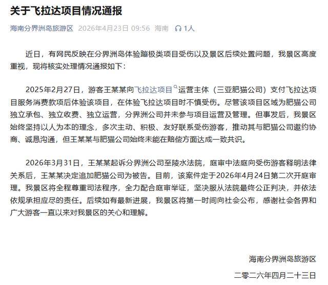 2026年3月31日,王某某起诉分界洲公司至陵水法院,庭审中法庭向受伤游客释明法律关系后,王某某决定追加肥猫公司为被告。目前,该案件定于2026年4月24日第二次开庭审理。我景区将全程尊重司法程序,全力配合庭审举证,坚决服从法院最终公正判决,并依法依规承担应尽的责任。后续如有最新进展,我景区将第一时间向社会公布,感谢社会各界和广大游客一直以来对我景区的关心和理解。